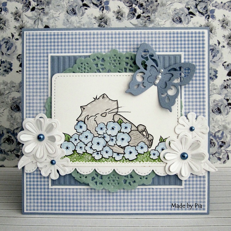 I used an image from a Tim Holtz stamp set for my card. He looks sick poor thing, all blue in his face. I had a piece of paper I had added different blue inks to and I stamped on this paper, heat embossing with black EP. I stamped his eyes on white paper, cut them out and mounted them on foam. I used a white die cut memory Box heart and a die cut LawnFawn panel with Kaisercraft DP and I spritzed the kraft paper with blue jeans colored mist. The sentiment, from Technique Tuesday, is heat embossed with silver EP and I added three sequins.