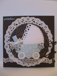 For his stepper card I have used blue and cream papers, stickers, lace, flowers and straws with pearls.